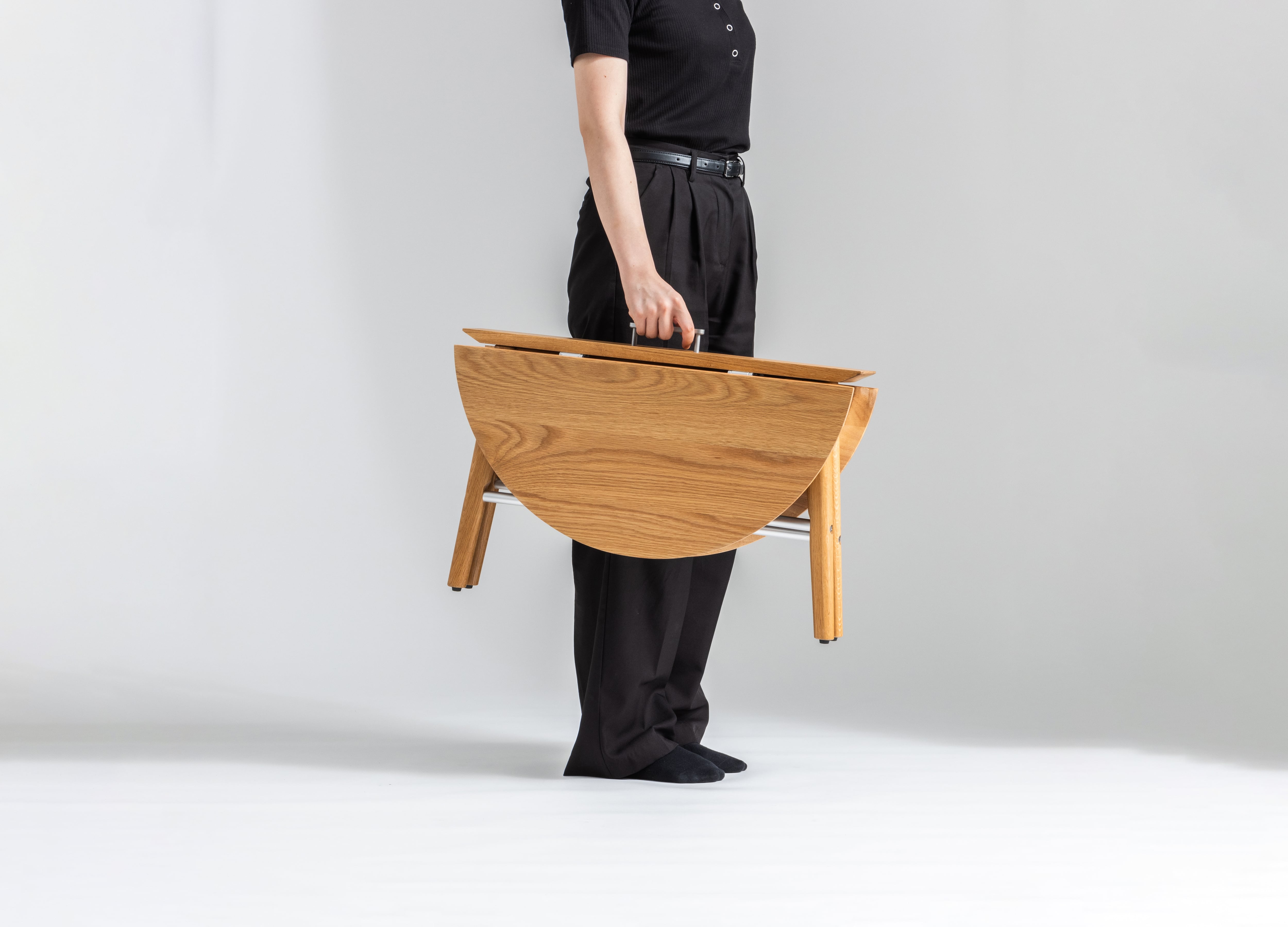 foxx chair® シリーズに、ブランドコンセプトはそのままの、サイドテーブルとラウンジテーブルが誕生しました。クロス型の脚を内側に折りたたみ、天板を左右に分割してたたむ独自の構造により、動作は極めてスムーズで、わずかな手の動きで瞬時に折りたたむことができます。本体にはアルミダイキャスト製のハンドルを美しく組み込み、引き出すだけで片手でも軽やかに持ち運びが可能に。ラウンジチェアと組み合わせれば、どこでも自分だけのくつろぎ空間が完成。読書やティータイム、パーソナルワークのひとときを、より自由に、より優雅に演出します。